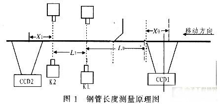 图中:K1和K2是两组光电开关,CCDl用来测量钢坯的总长,CCD2用来测量钢坯的段长,当钢坯切头后碰到光电开关Kl时,用CCDl相机测出钢坯的尾部长度为X0。假设Kl到CCDl像机测量视场的左边缘为L0,则总长为Ln+X0。测出总长后,经过计算机配尺后,由CCD2控制剪切长度,通过CCD2测出段长,当钢坯的头部碰上K2时,CCD2开始测量。假设CCD2测出的长度为X1,K2和剪口之间的距离为L1,则段长即为L1+X1,段长是在线实时测量、实时显示的。测量X0,X1的过程是这样的:由于测量对象为热轧钢坯,温度在l 000℃左右,本身就是一个发光体。因此测量对象无需外用光源照明,光电开关采用主动式工作,当钢坯运行挡住光电开关发射的信号,光电开关信号就通过测量控制板产生外部中断信号,向计算机申请外部中断,控制CCD摄像机进行数据采集,对采集结果进行滤波后,进行二值化处理,并进行一系列的标定、处理,即可得到被测钢坯的长度。